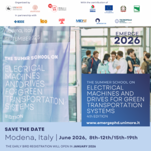 Summer School on ‘Electrical Machines and Drives for Green Transportation systems’ – 4th Edition The Summer School on ‘Electrical Machines and Drives for Green Transportation ... 08 - 12 Giu 9:00 am - 6:00 pm Tecnopolo di Modena